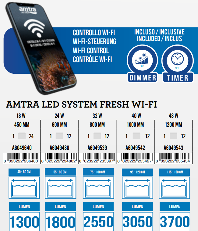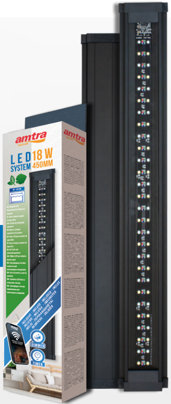SYSTÈME AMTRA LED FRAIS. est un système d’éclairage complet pour les aquariums d’eau douce. Grâce à son niveau de protection élevé (IP67), il peut être utilisé aussi bien dans des réservoirs ouverts que dans des aquariums fermés. MINUTERIE et DIMMER INCLUS pour programmer le cycle solaire quotidien de votre aquarium. Le KIT dispose également de deux types différents de supports de barre LED. La température de couleur et l’intensité de l’éclairage sont entièrement personnalisables sur 5 canaux différents (RGB + Cool White 6500K + Warm White 4000K). Corps en aluminium et ABS pour donner plus de solidité au produit!