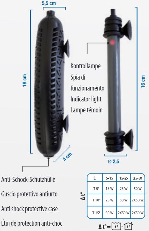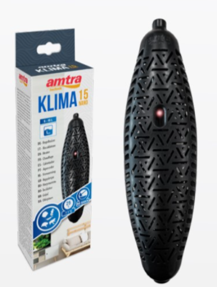 AMTRA KLIMA NANO PRESET est un chauffage automatique pouvant fonctionner en totale immersion dans un aquarium, paludarium et bac à tortues. La température de fonctionnement est préréglée à 25°C (± 1°C), valeur idéale pour la plupart des poissons et animaux tropicaux. Sa dimension réduite permet de l’installer dans des nano-aquariums sans en modifier l’esthétique. La gaine de protection le rend particulièrement fiable pour une utilisation en présence d’animaux comme tortues ou amphibiens.
